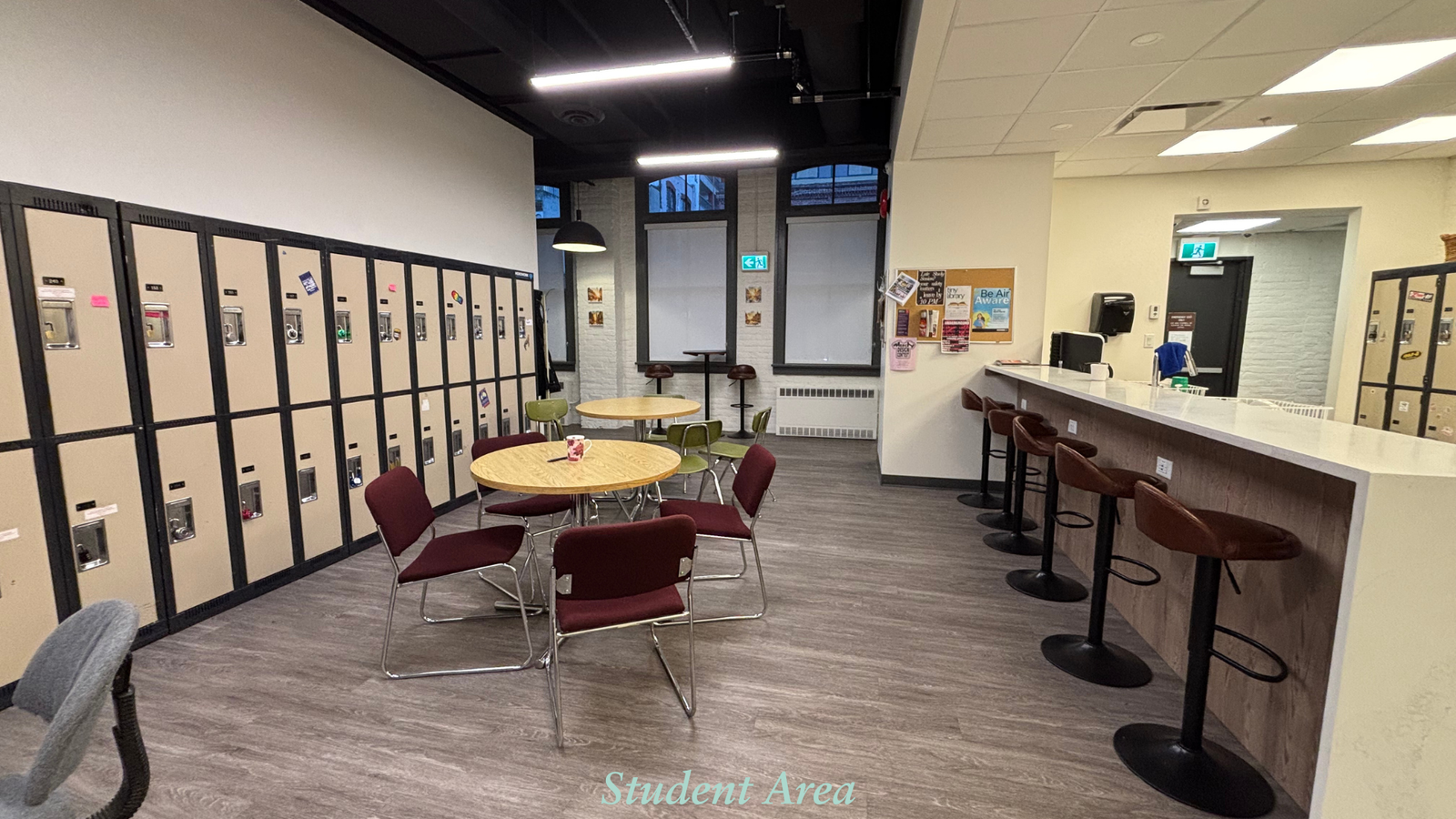 The PDA space is fully air-conditioned and wheelchair accessible, creating a comfortable and inclusive environment for everyone. It includes nine washrooms and a shared kitchen outfitted with two microwaves, two refrigerators, a toaster, a filtered water dispenser offering unlimited hot and cold water, and a dedicated food prep area with a sink. Wireless internet is available throughout. Most rooms are bright and classic in style, with large windows that bring in abundant natural light.