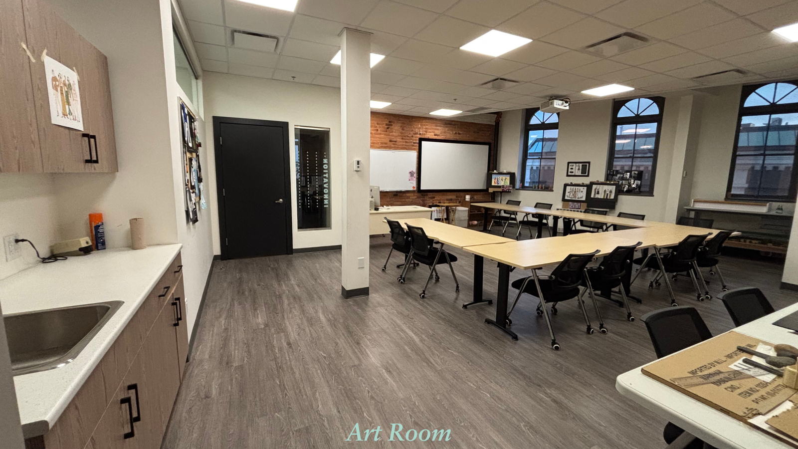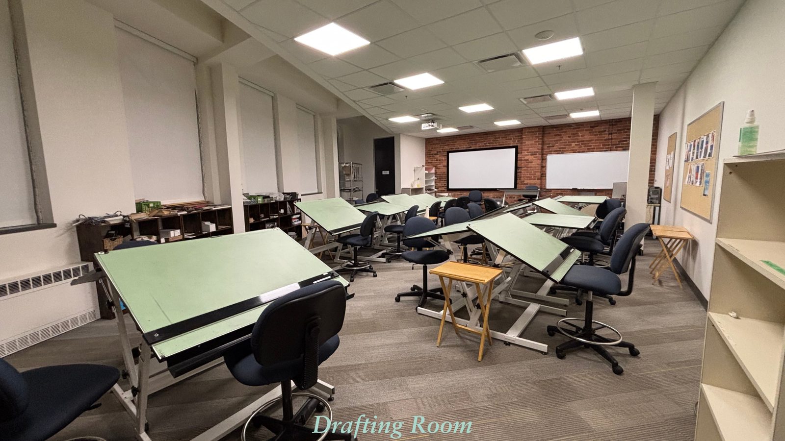 Carpeted floor; Projector with HDMI cable; Whiteboard; iMac; Professional Drafting Tables and chairs