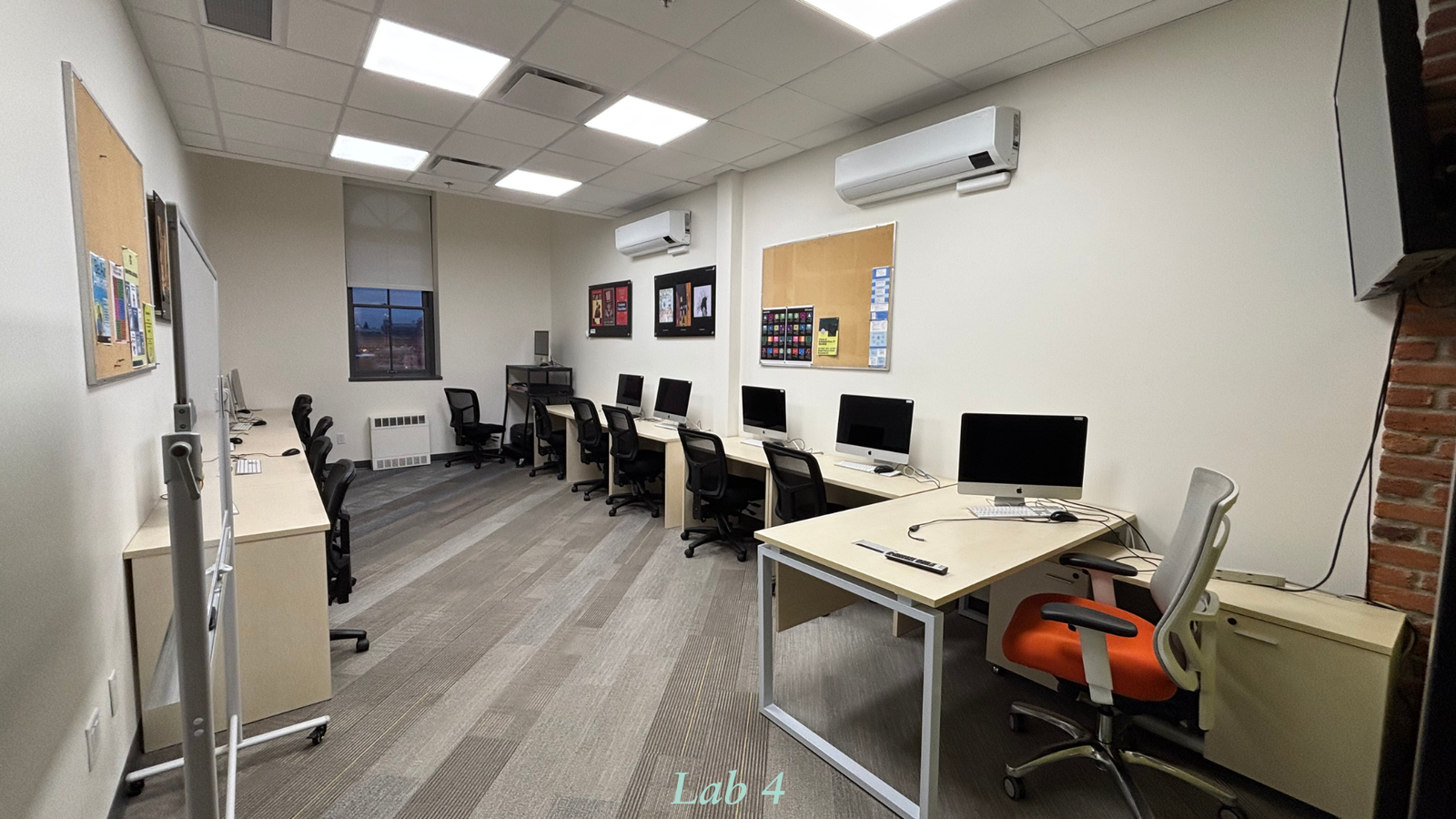 Carpeted floor; 55" TV with HDMI cable; Whiteboard; 10 iMacs, Chairs