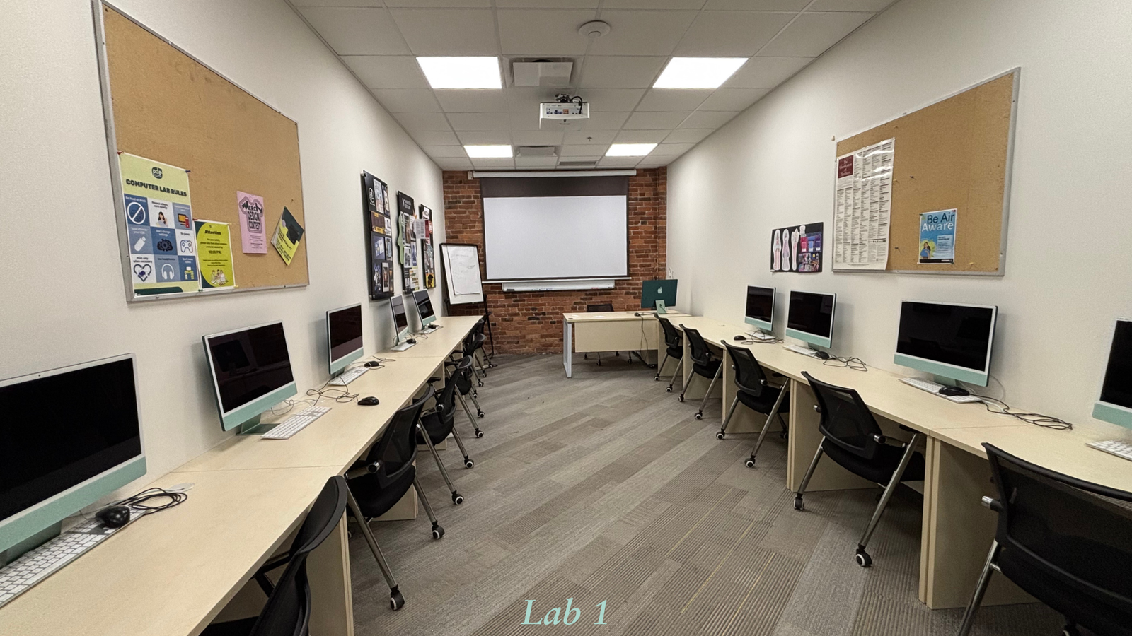 Carpeted floor; Projector with HDMI cable; Whiteboard, 14 iMacs, Chairs