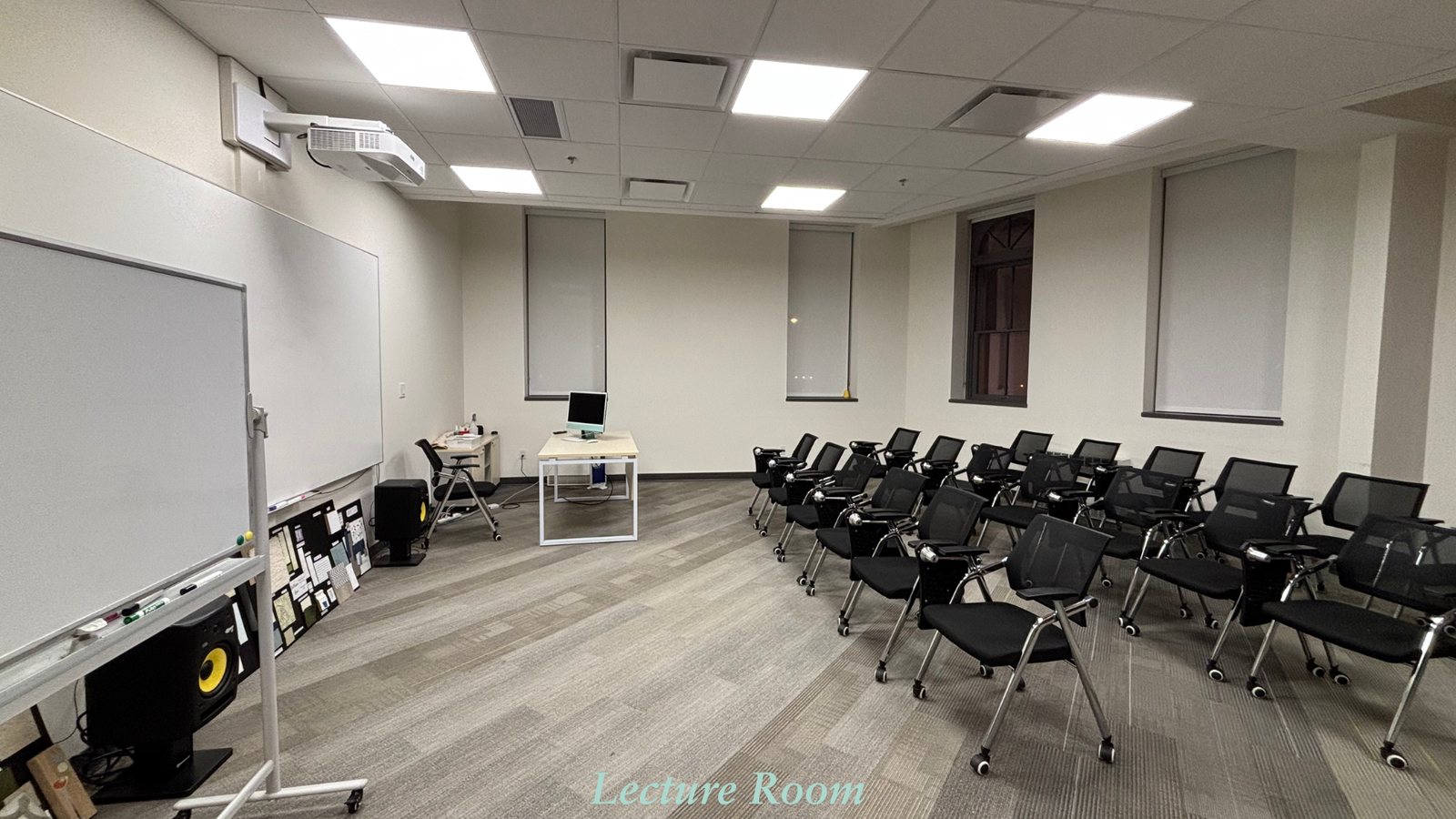 Carpeted floor; Projector with HDMI cable; Whiteboard; 16 Windows Computers; Chairs